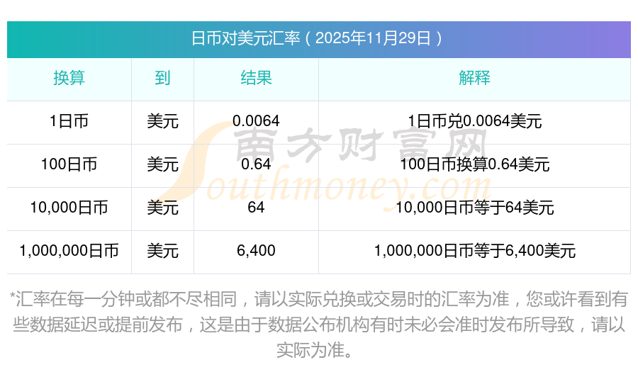 2025年11月29日日幣對美元的匯率為:0.0064
