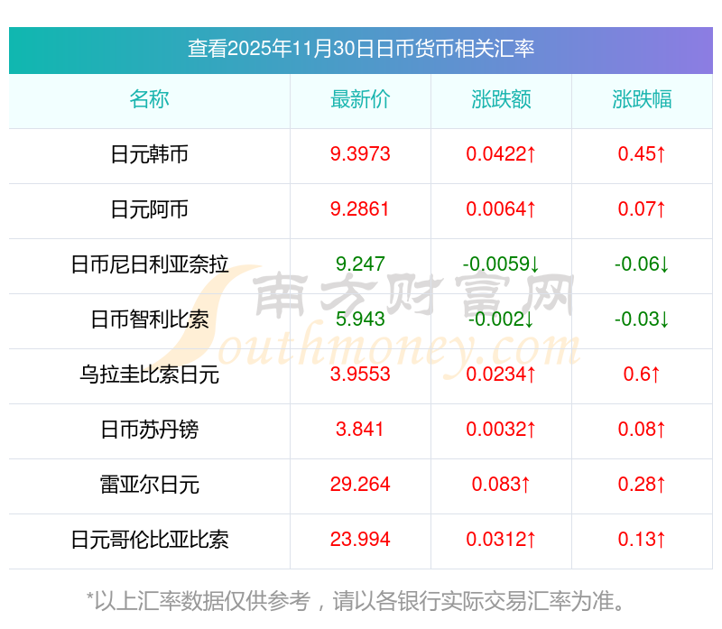 2025年11月30日日幣相關(guān)匯率查詢