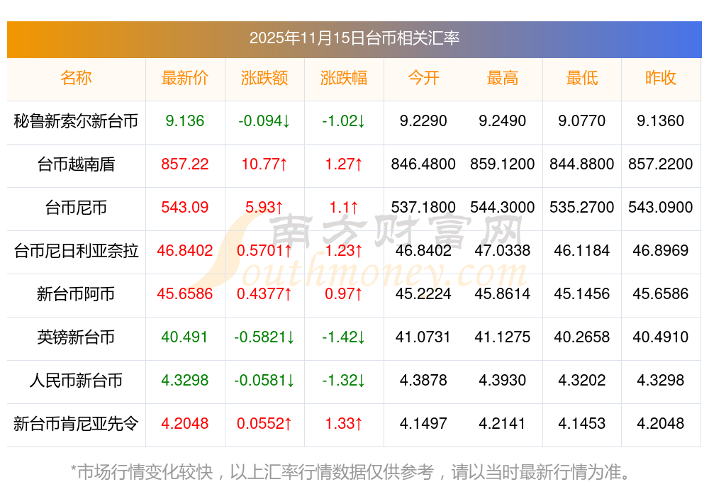 根據(jù)2025年11月15日匯率計算,臺幣兌換加幣匯率最新價0.045620,今開價0.0451,昨收價0.0456,最高價0.0457,最低價0.0450。