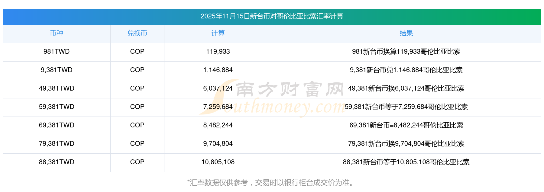 現(xiàn)在95新臺(tái)幣換多少哥倫比亞比索(2025年11月15日)
