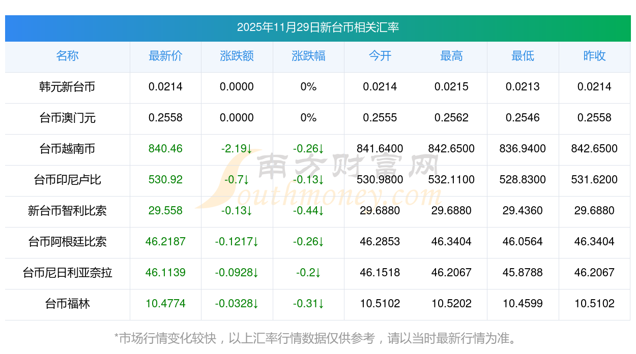 2025年11月29日新臺幣相關(guān)匯率查詢