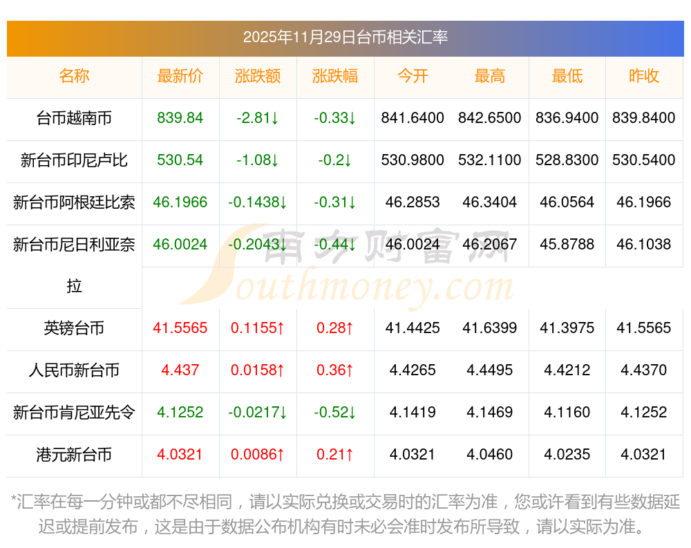 2025年11月29日臺幣相關(guān)匯率查詢