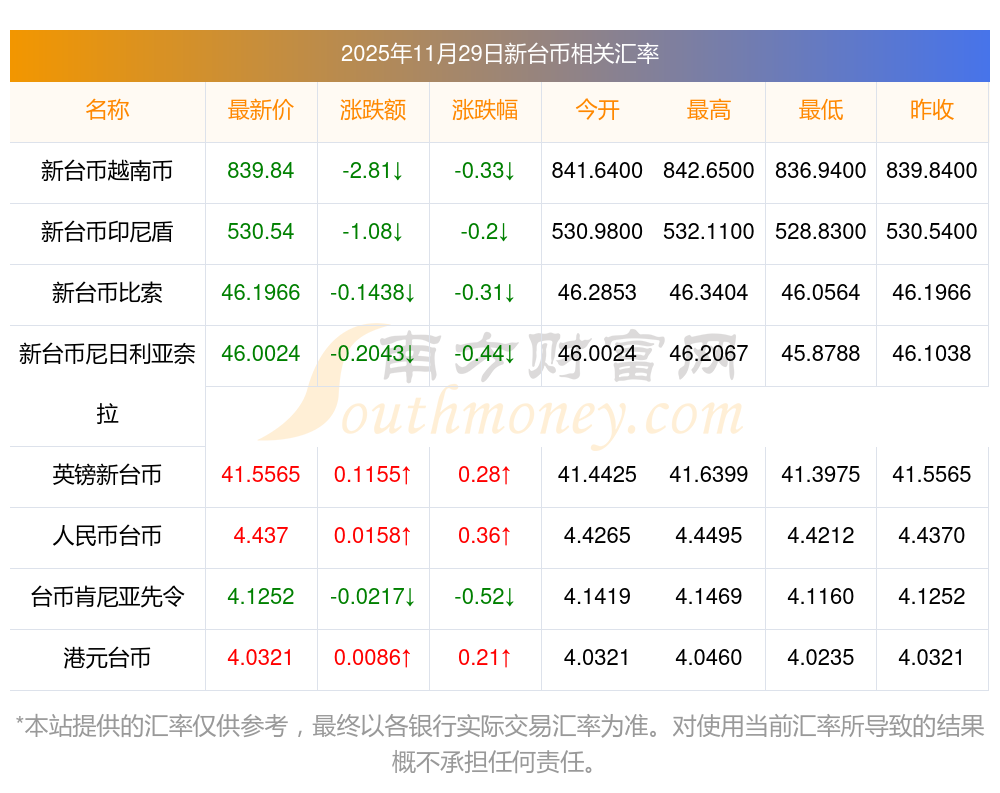 2025年11月29日新臺(tái)幣相關(guān)匯率查詢