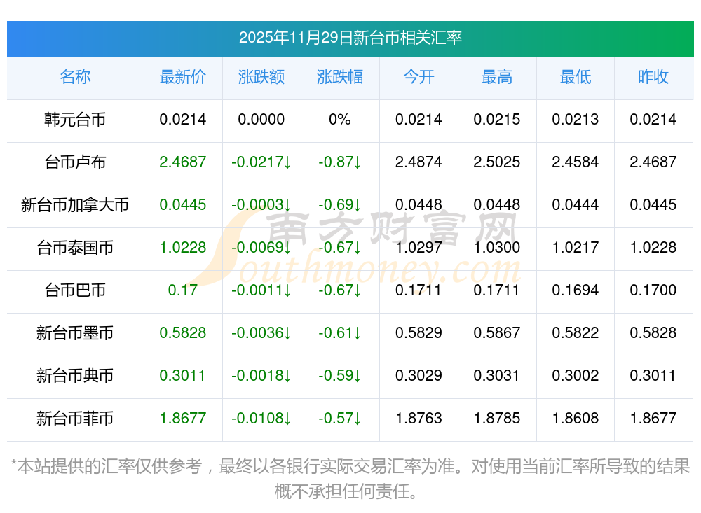 2025年11月29日新臺(tái)幣相關(guān)匯率查詢