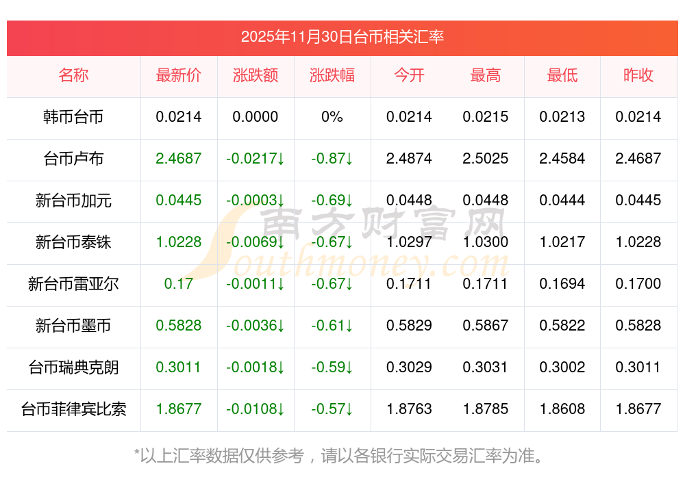 根據(jù)2025年11月30日匯率計算,TWD兌換RUB匯率最新價2.468700,今開價2.4874,昨收價2.4687,最高價2.5025,最低價2.4584。
