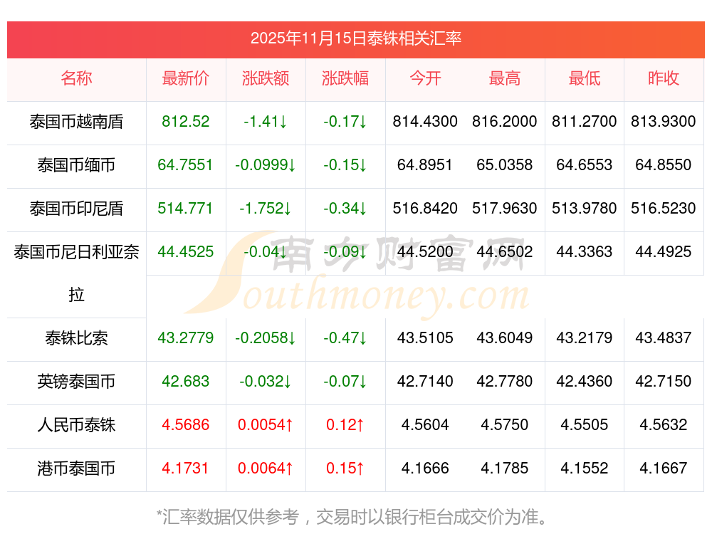 根據(jù)今天2025年11月15日匯率計算,THB兌換CHF匯率最新價0.024500,今開價0.0245,昨收價0.0245,最高價0.0246,最低價0.0243。