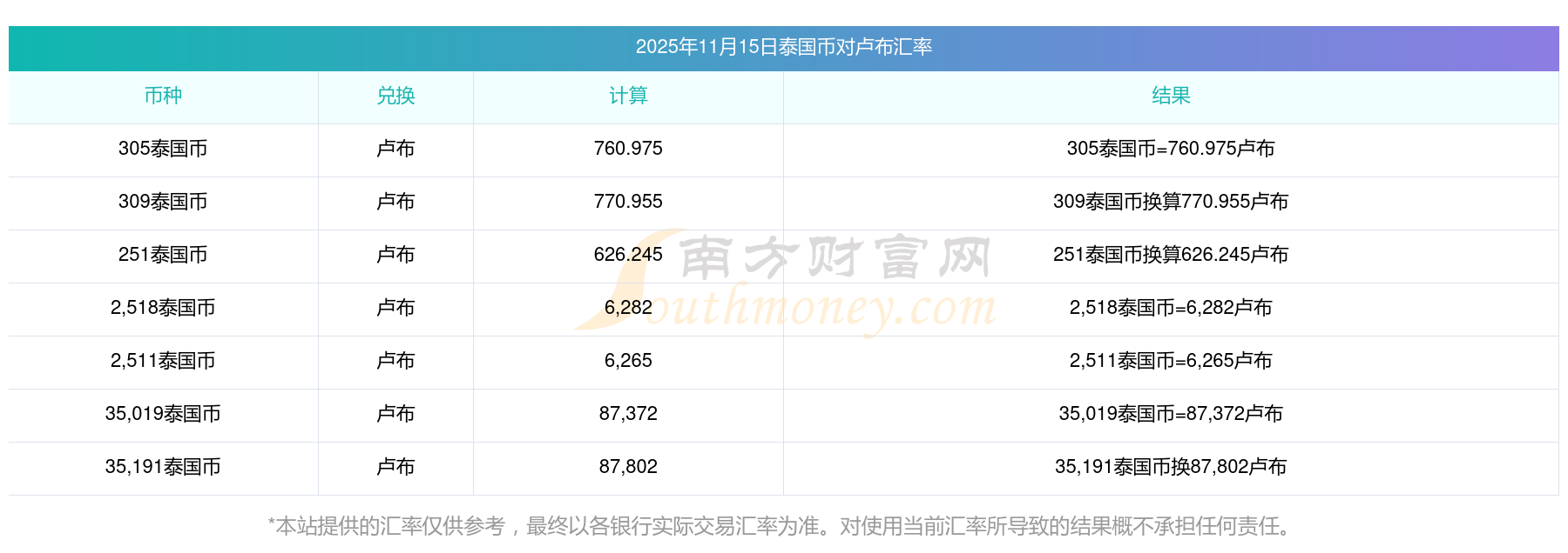 南方財富網為您提供泰國幣對盧布匯率最新價格詳情。