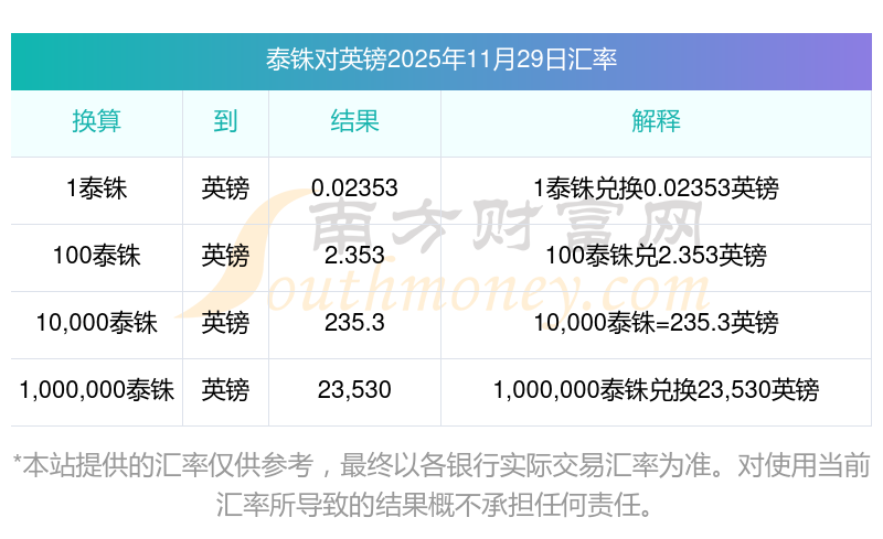 匯率實(shí)時(shí)更新!67泰銖兌換英鎊匯率表(2025年11月29日)