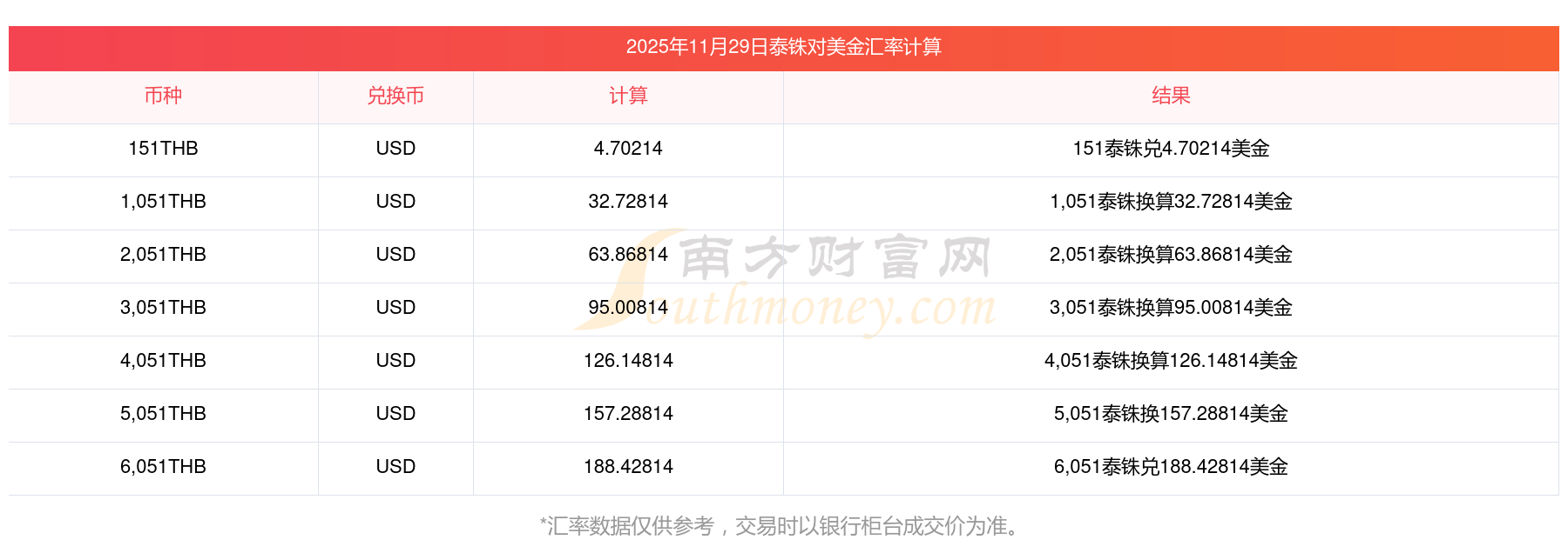 南方財富網(wǎng)為您提供泰銖對美金匯率最新價格詳情。