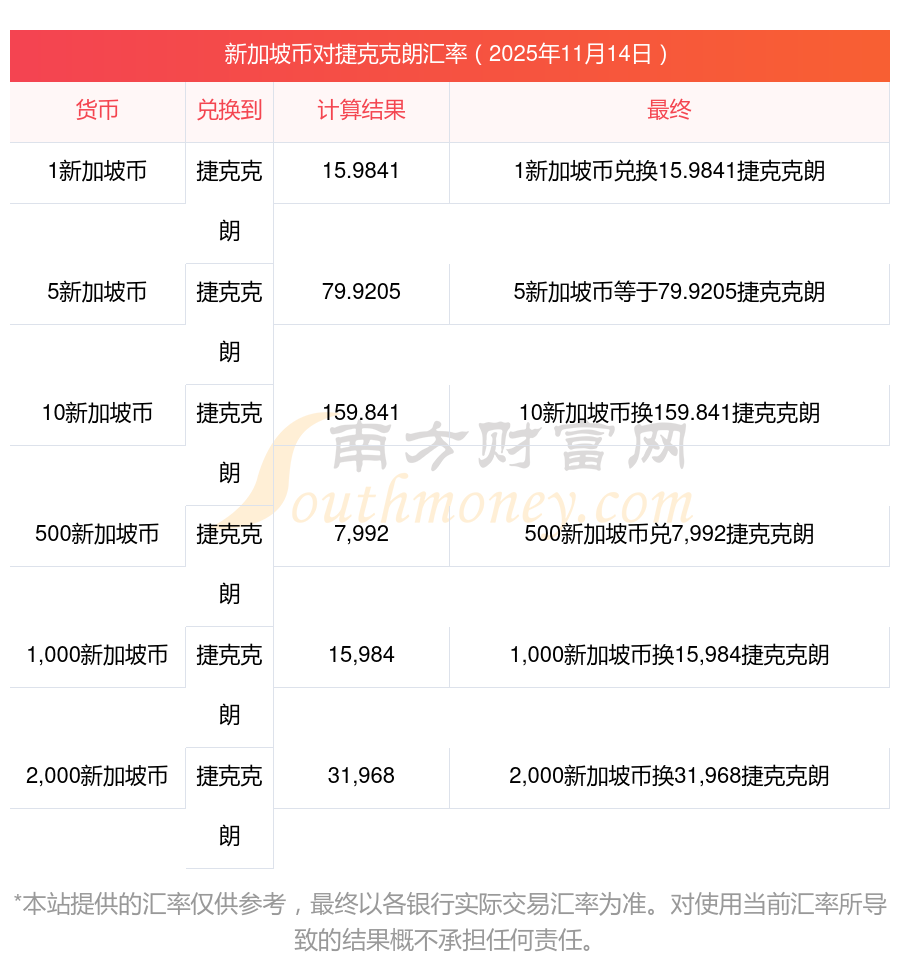 最新70新加坡幣兌換捷克克朗折算匯率表_今天外匯查詢2025-11-14
