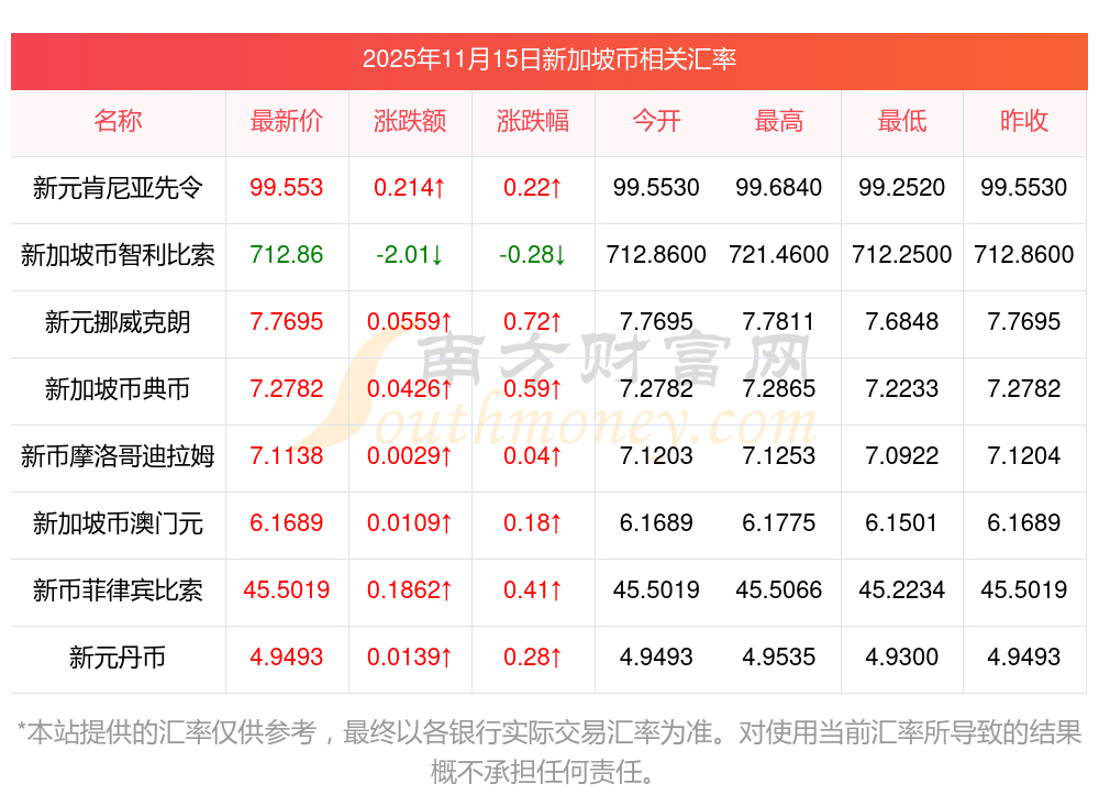 2025年11月15日新加坡幣相關(guān)匯率查詢