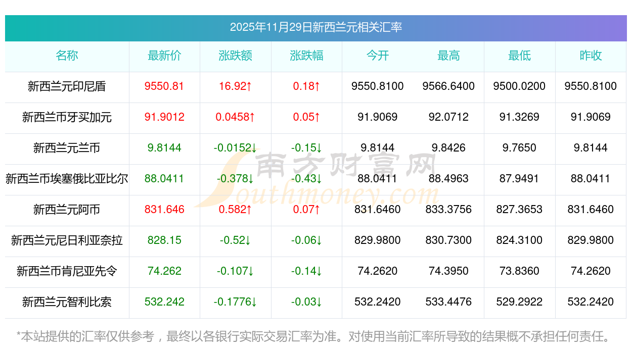 2025年11月29日新西蘭元相關(guān)匯率查詢