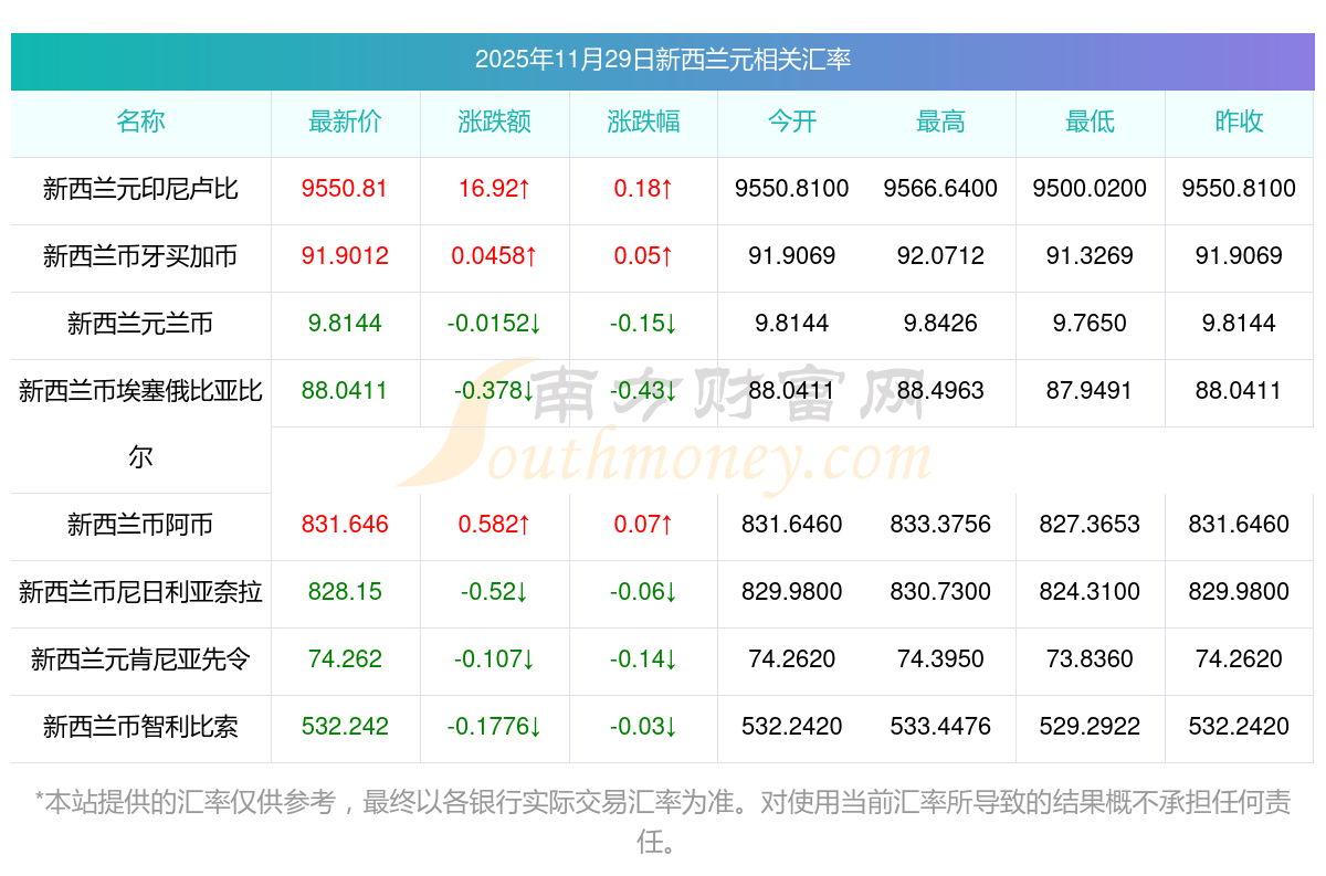 2025年11月29日新西蘭元相關(guān)匯率查詢