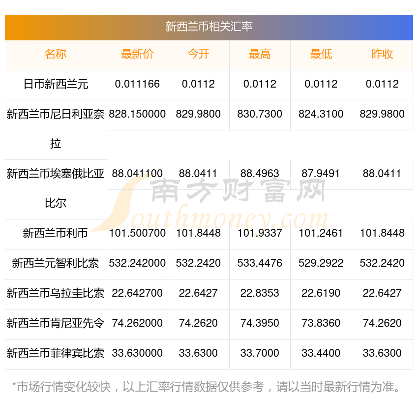 南方財(cái)富網(wǎng)為您提供新西蘭幣對(duì)尼日利亞奈拉匯率最新價(jià)格詳情。