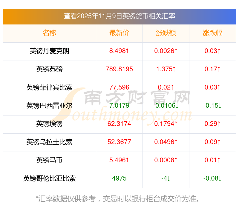 2025年11月9日英鎊相關匯率查詢