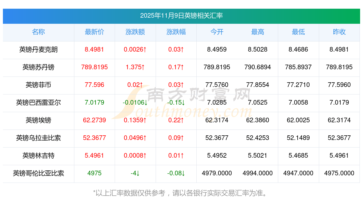根據(jù)2025年11月9日匯率計算,英鎊兌換巴西雷亞爾匯率最新價7.017900,今開價7.0285,昨收價7.0179,最高價7.0525,最低價7.0058。