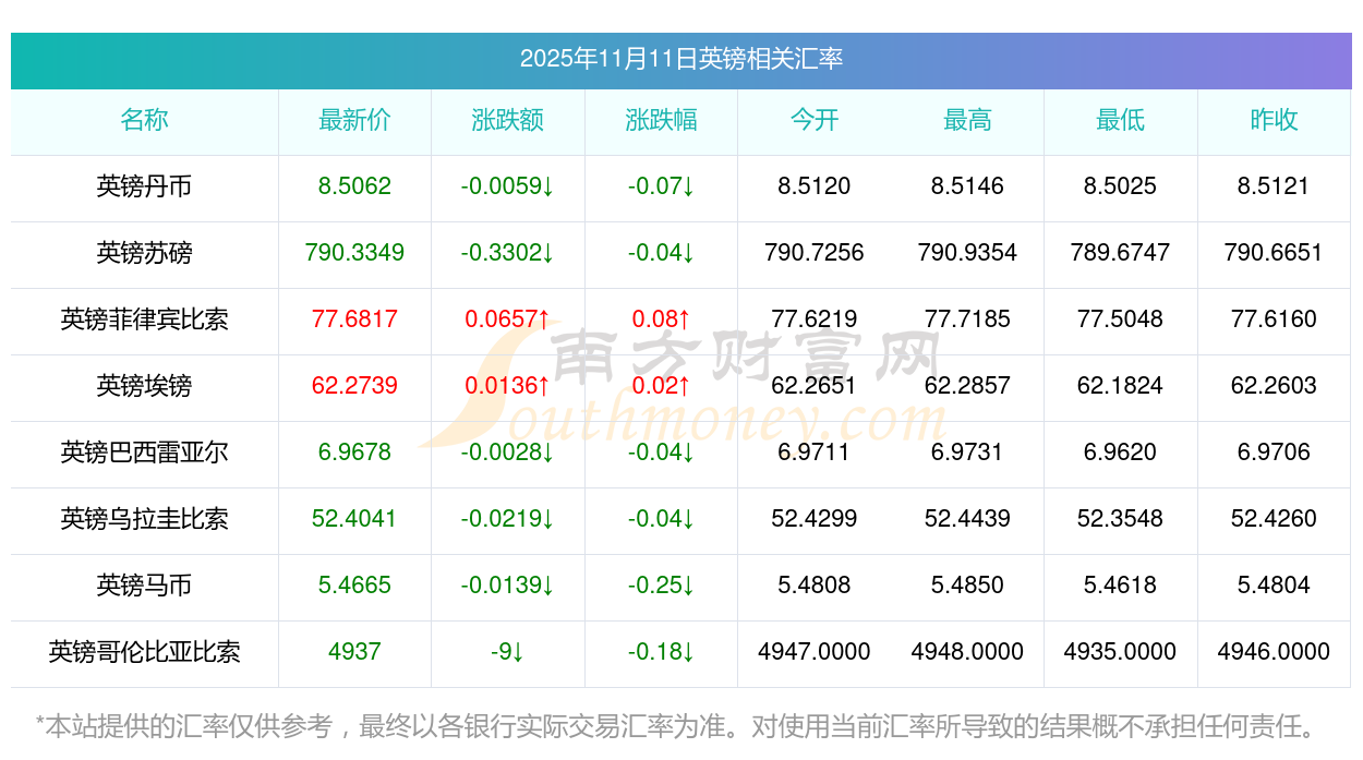 根據(jù)2025年11月11日匯率,英鎊兌換摩洛哥迪拉姆匯率最新價(jià)12.215700,今開價(jià)12.2174,昨收價(jià)12.2232,最高價(jià)12.2267,最低價(jià)12.1893。
