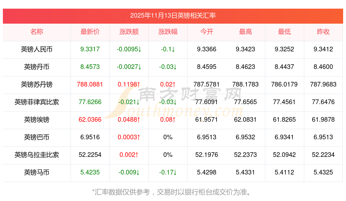 根據(jù)2025年11月13日匯率,英鎊兌換挪朗匯率最新13.228600,今開13.2440,昨收13.2431,最高13.2562,最低13.2067。