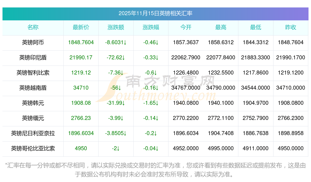 根據(jù)2025年11月15日匯率計(jì)算,GBP兌換NZD匯率最新價(jià)2.318500,今開價(jià)2.3331,昨收價(jià)2.3185,最高價(jià)2.3383,最低價(jià)2.3087。