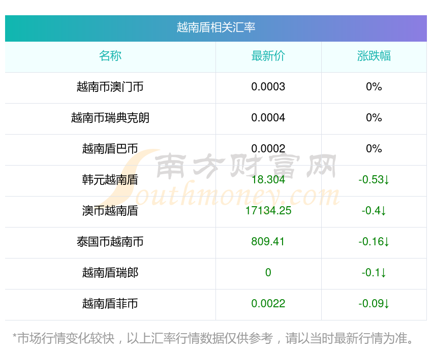 南方財富網(wǎng)為您提供越南盾對瑞郎匯率最新價格詳情。