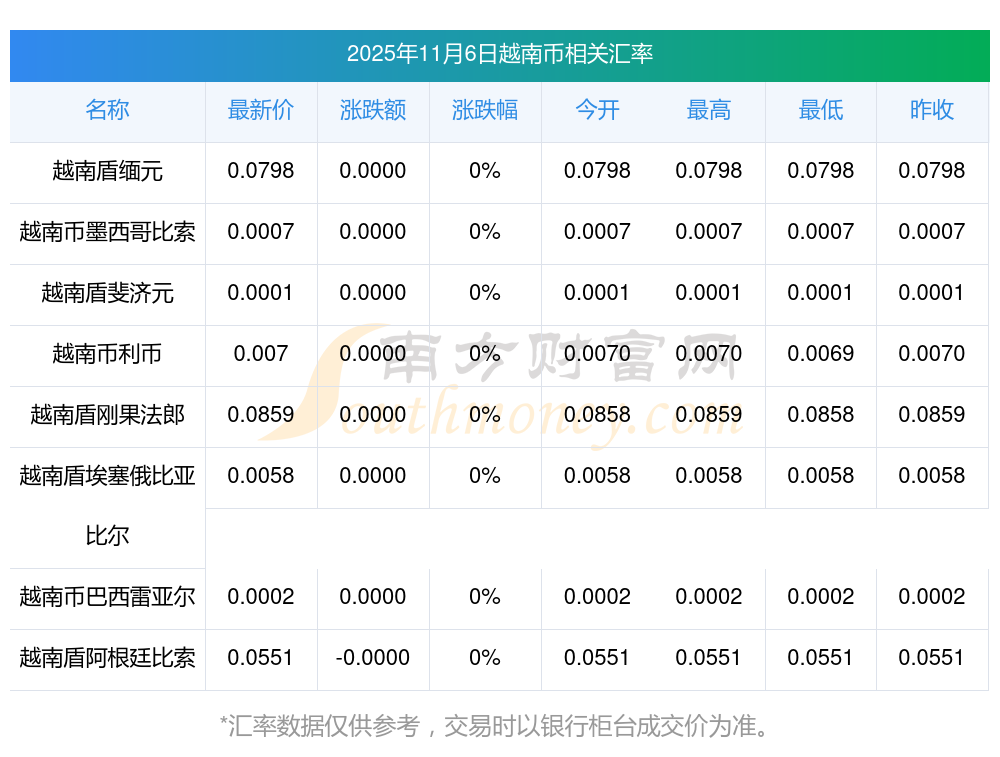 根據(jù)2025年11月6日匯率,越南幣兌換墨西哥比索匯率最新價0.000707,今開價0.0007,昨收價0.0007,最高價0.0007,最低價0.0007。