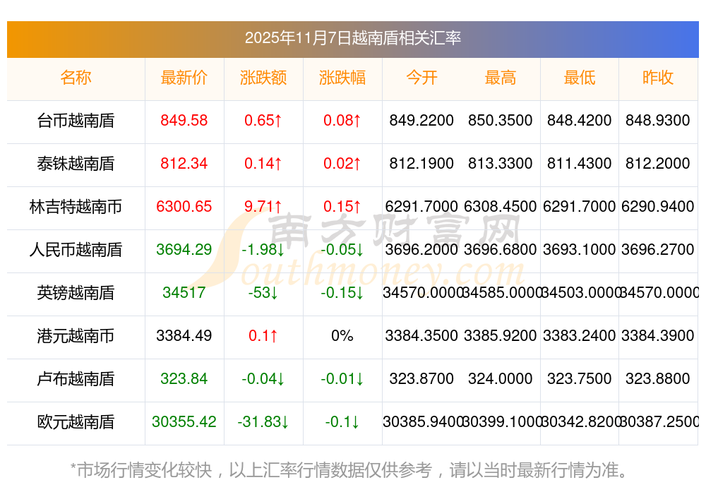 根據(jù)2025年11月7日匯率計(jì)算,VND兌換BRL匯率最新價(jià)0.000203:今開價(jià)0.0002,昨收價(jià)0.0002,最高價(jià)0.0002,最低價(jià)0.0002。