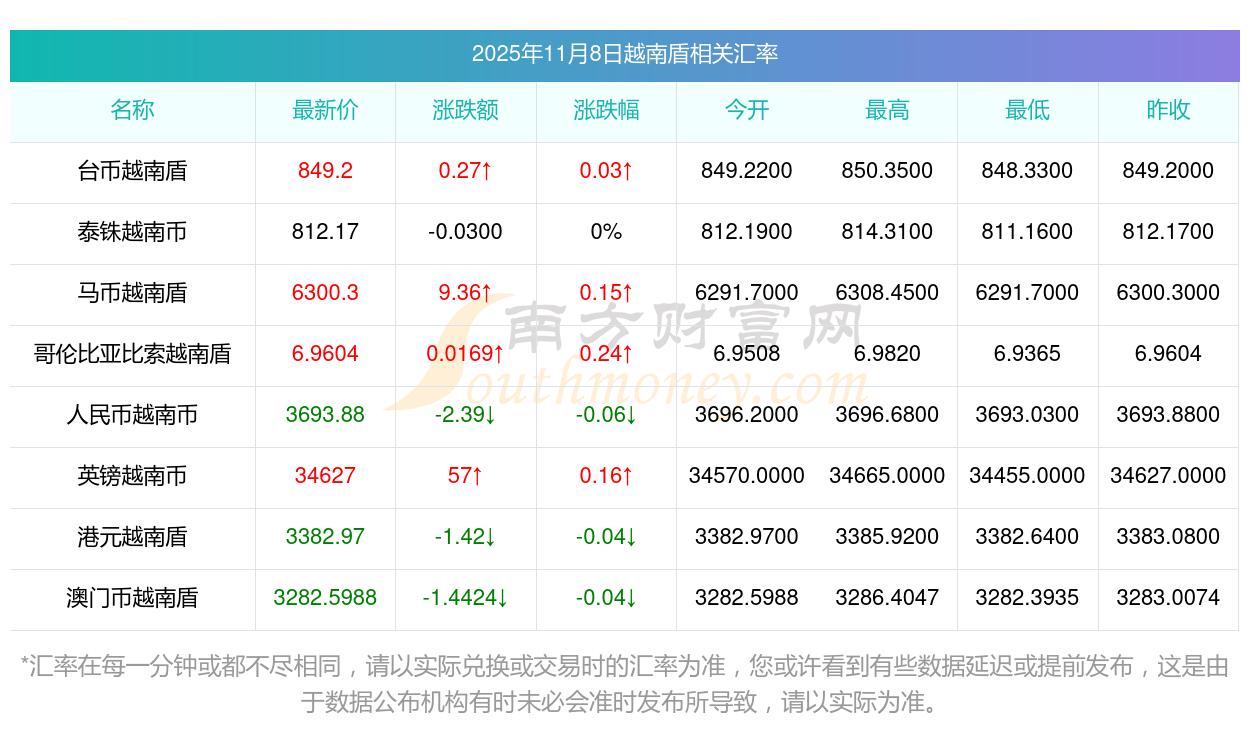 根據(jù)2025年11月8日匯率,越南盾兌換南非蘭特匯率最新價(jià)0.000657,今開價(jià)0.0007,昨收價(jià)0.0007,最高價(jià)0.0007,最低價(jià)0.0007。