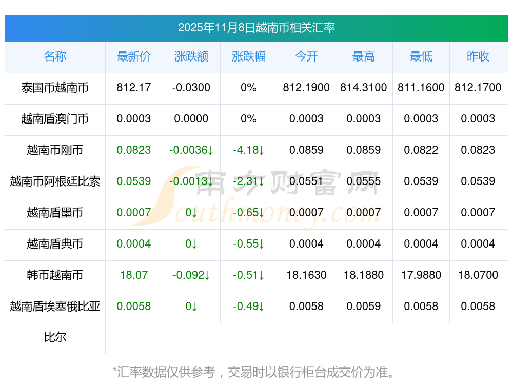 2025年11月8日越南幣兌換美元最新匯率:0.000038,今開:0.0000,昨收:0.0000,最高:0.0000,最低:0.0000。