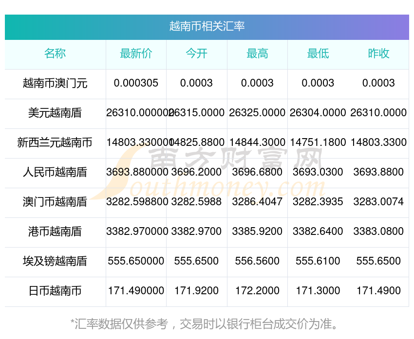 南方財富網(wǎng)為您提供越南幣對瑞郎匯率最新價格詳情。