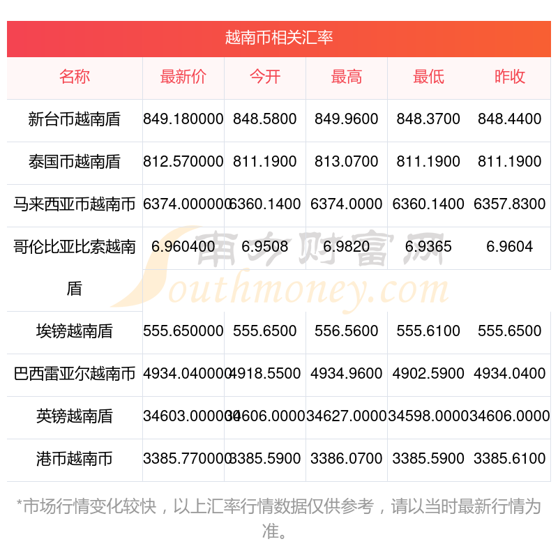 南方財富網(wǎng)為您提供越南幣對摩洛哥迪拉姆匯率最新價格詳情。