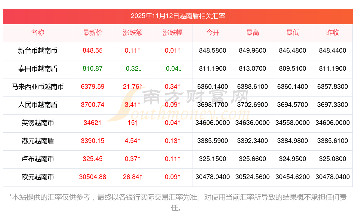 根據(jù)2025年11月12日匯率,越南盾兌換印尼盧比匯率最新價0.634800,今開價0.6339,昨收價0.6341,最高價0.6356,最低價0.6335。