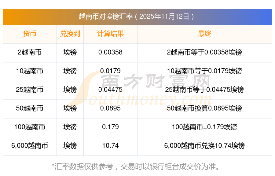 匯率今日:越南幣兌換埃鎊匯率(2025年11月12日)