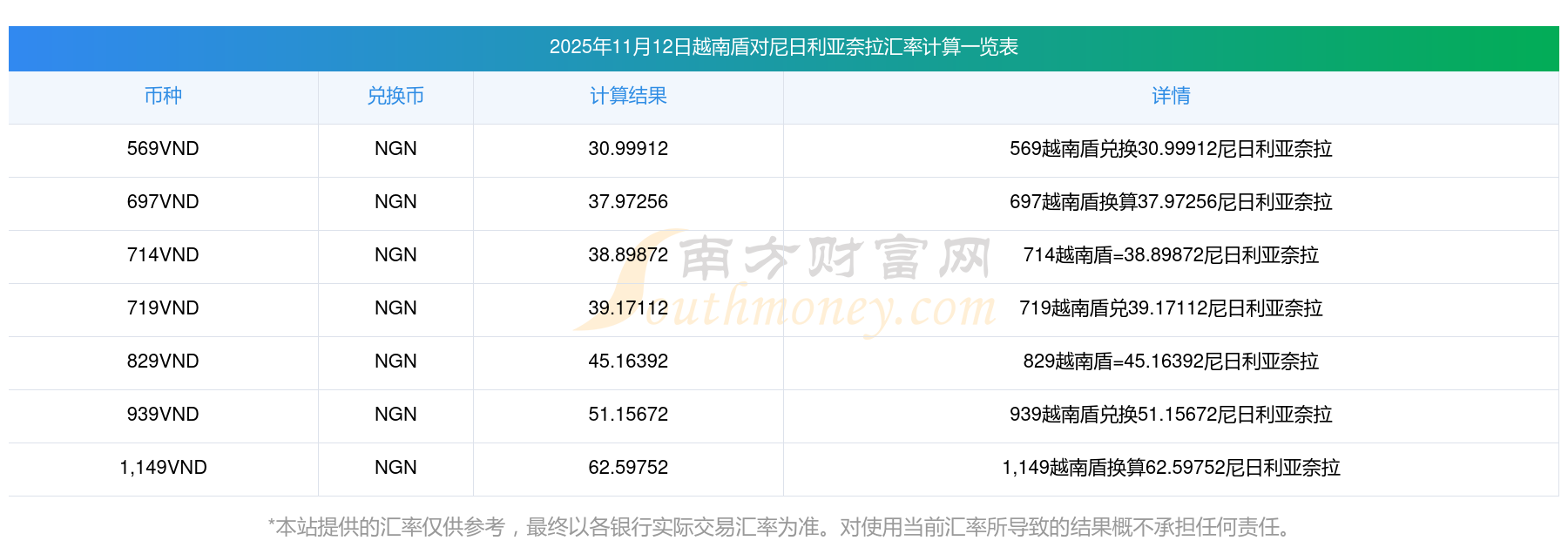 2025年11月12日越南盾與尼日利亞奈拉的兌換匯率計算如下:
