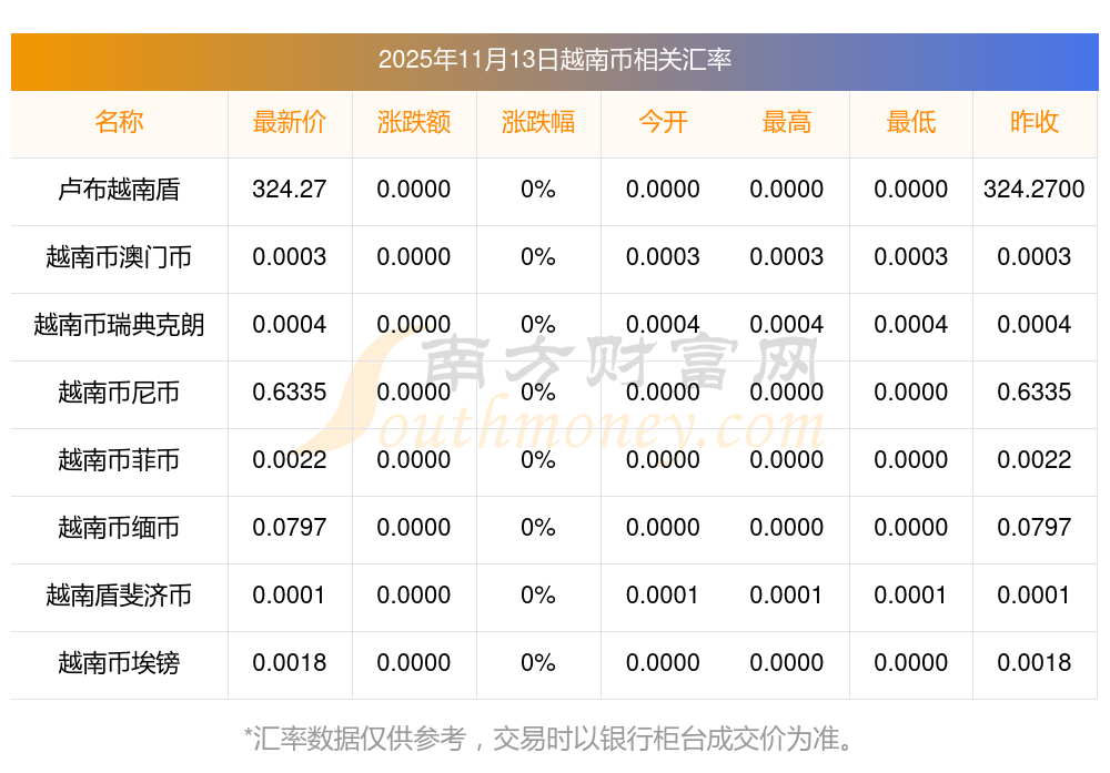 根據(jù)2025年11月13日匯率計算,VND兌換MOP匯率最新價0.000304:今開價0.0003,昨收價0.0003,最高價0.0003,最低價0.0003。