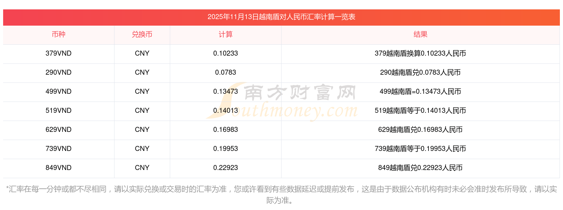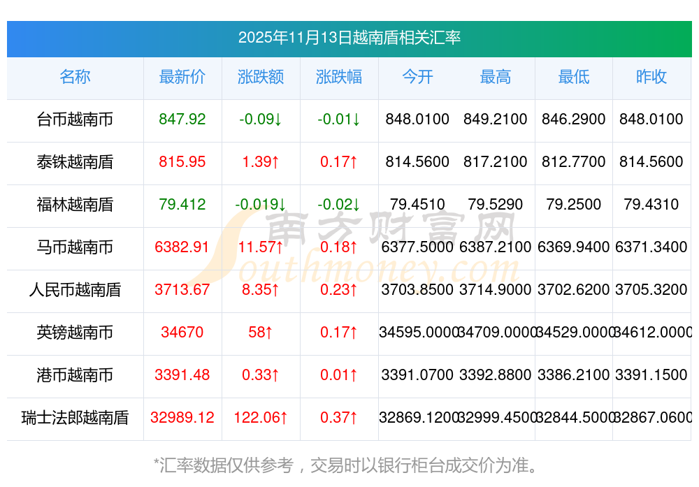 貨幣越南盾兌換人民幣匯率多少?11月13日