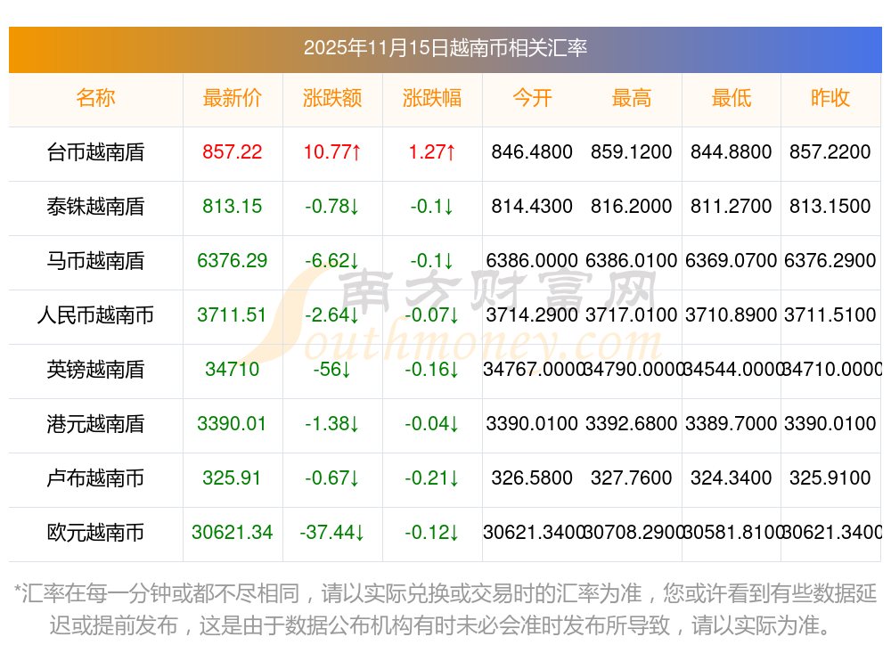 根據(jù)2025年11月15日匯率計(jì)算,VND兌換EGP匯率最新價(jià)0.001791:今開(kāi)價(jià)0.0018,昨收價(jià)0.0018,最高價(jià)0.0018,最低價(jià)0.0018。