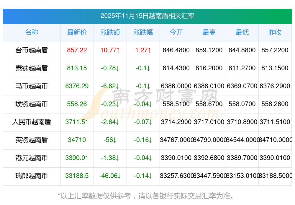 根據(jù)2025年11月15日匯率計(jì)算,VND兌換ZAR匯率最新價(jià)0.000648:今開價(jià)0.0006,昨收價(jià)0.0006,最高價(jià)0.0007,最低價(jià)0.0006。