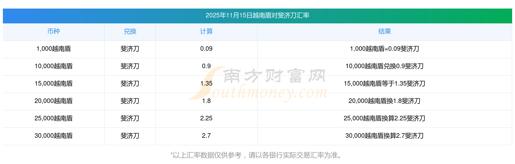 南方財富網(wǎng)為您提供越南盾對斐濟刀匯率最新價格詳情。