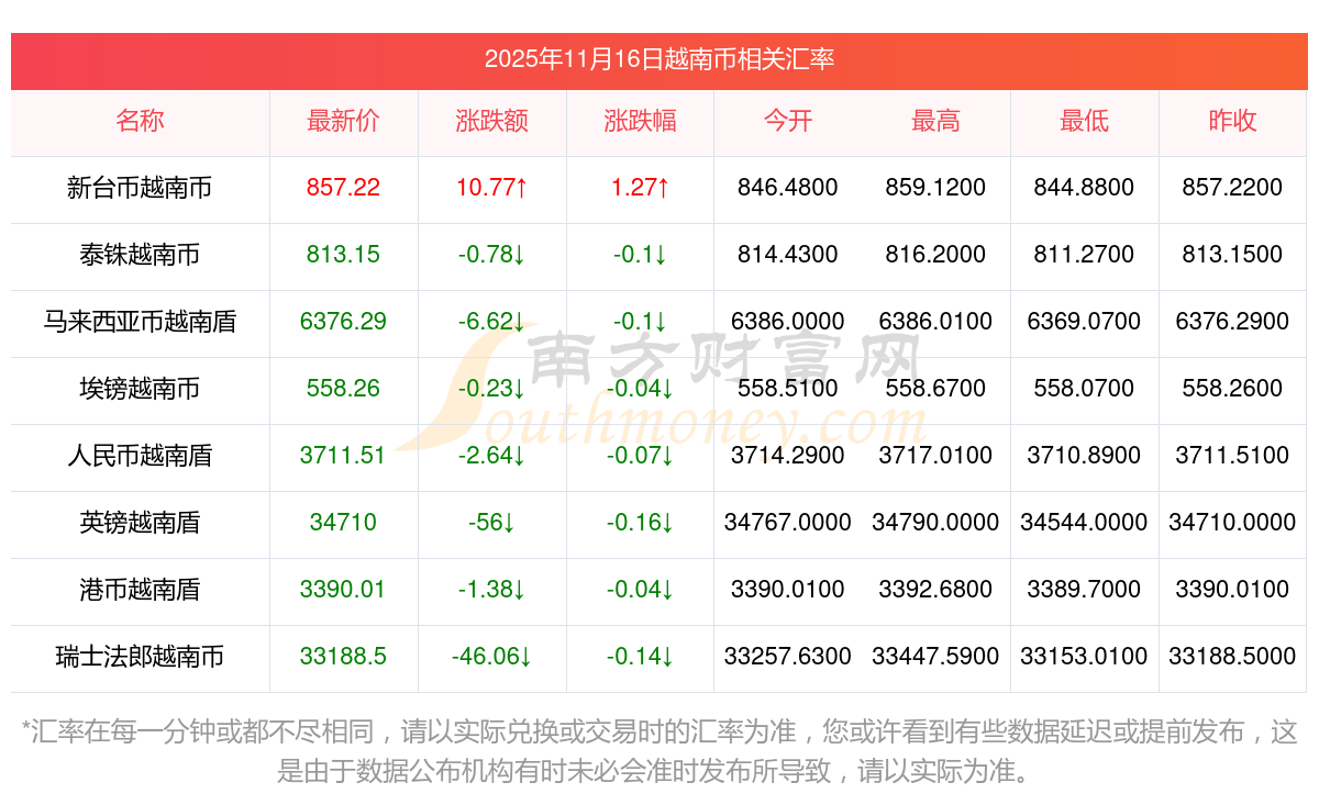 2025年11月16日越南幣兌換瑞典克朗最新匯率:0.000362,今開:0.0004,昨收:0.0004,最高:0.0004,最低:0.0004。