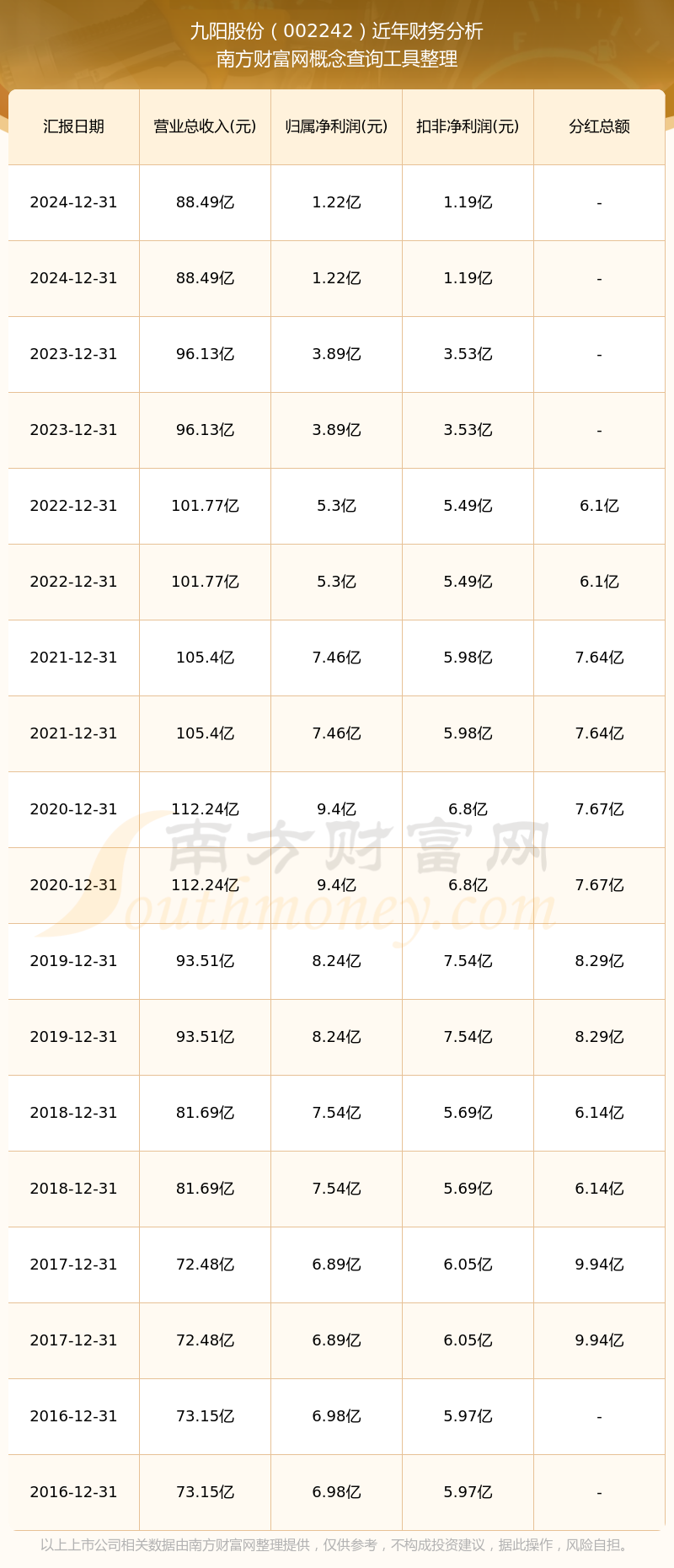 2024年報(bào)顯示,九陽股份實(shí)現(xiàn)營(yíng)收88.49億,同比增長(zhǎng)-7.94%;凈利潤(rùn)1.22億,同比增長(zhǎng)-68.55%;毛利率25.5%。