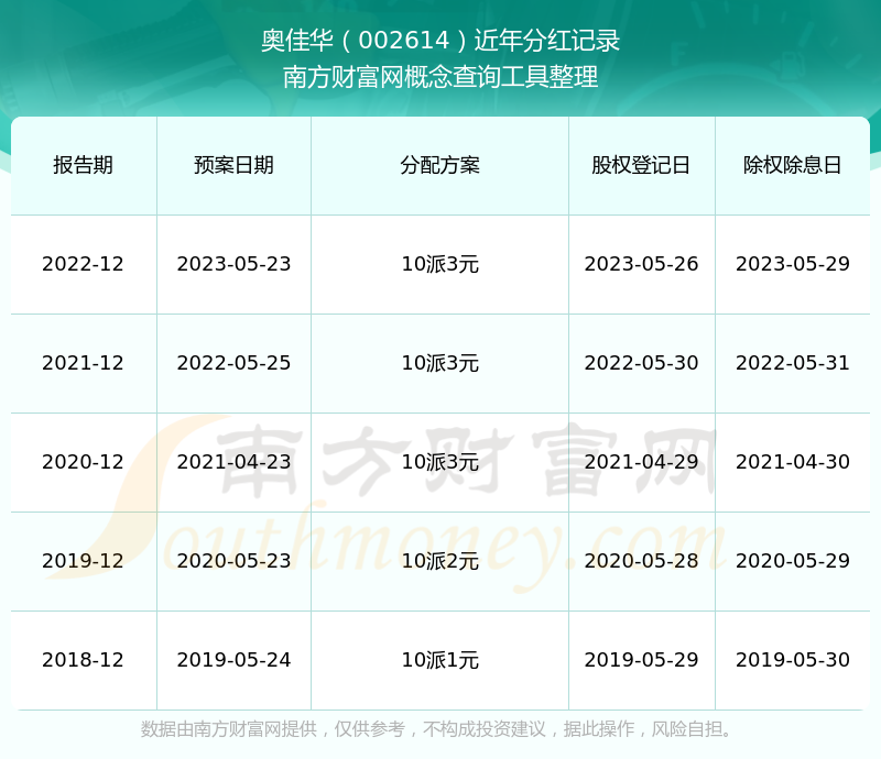 奧佳華最新一次公布的分紅方案為10派3元。本次權(quán)益分派股權(quán)登記日為2023年5月26日,除權(quán)除息日為2023年5月29日,派息日為2023年5月29日。