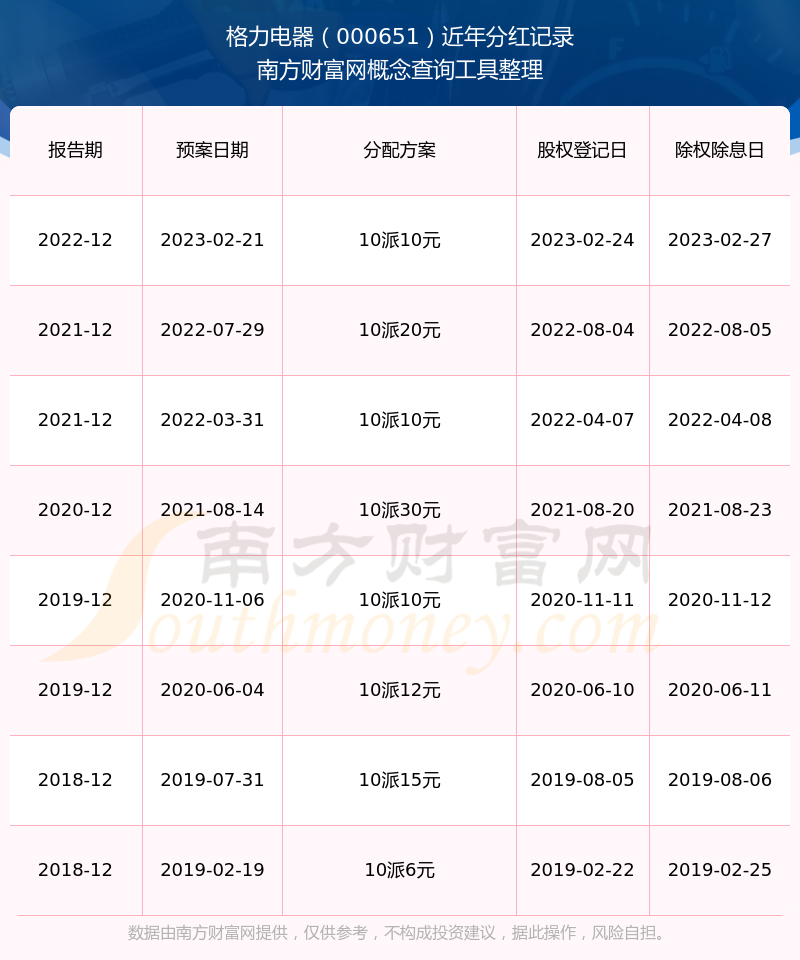 格力電器最新一次公布的分紅方案為10派10元。本次權(quán)益分派股權(quán)登記日為2023年2月24日,除權(quán)除息日為2023年2月27日,派息日為2023年2月27日。