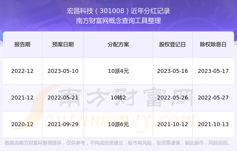 宏昌科技最新一次公布的分紅方案為10派4元。本次權(quán)益分派股權(quán)登記日為2023年5月16日,除權(quán)除息日為2023年5月17日,派息日為2023年5月17日。