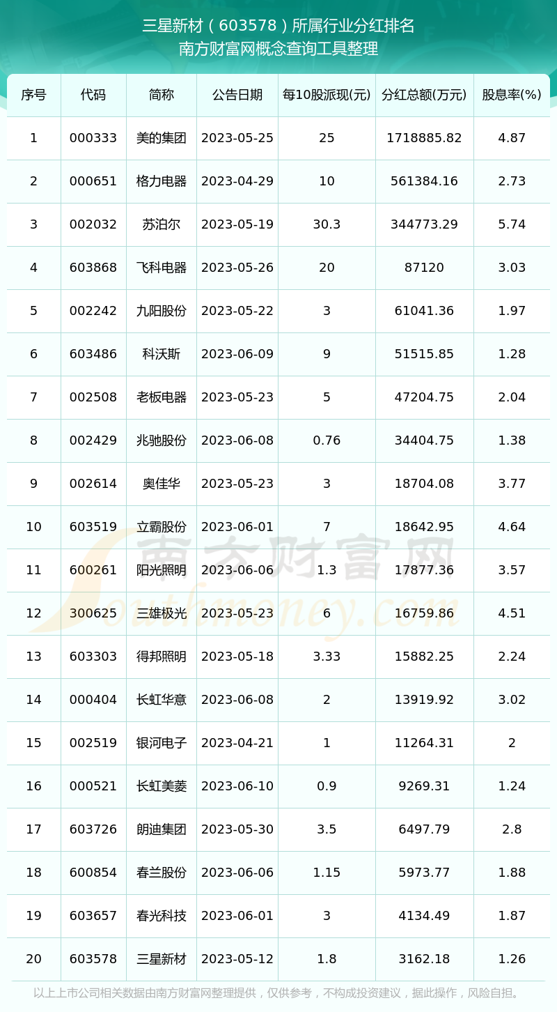 按照南方財富網(wǎng)趨勢選股系統(tǒng)統(tǒng)計(jì),三星新材所屬行業(yè)為家電行業(yè)行業(yè),家電行業(yè)行業(yè)分紅排名情況如下表: