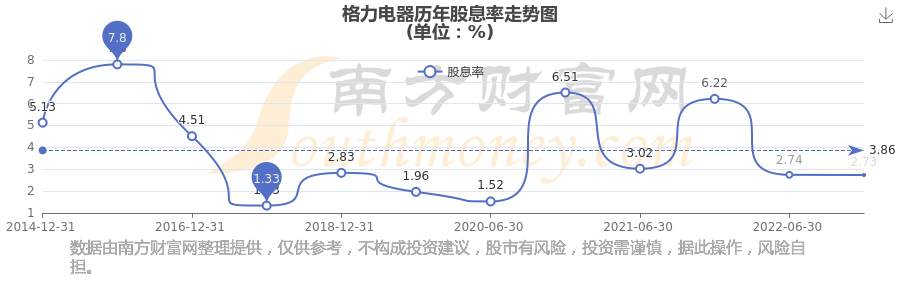 格力電器歷年股息率走勢如下圖: