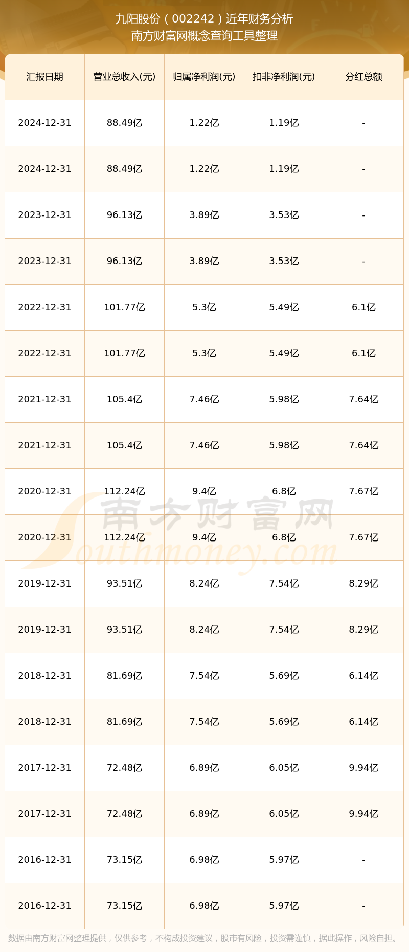 2024年報顯示,九陽股份實現(xiàn)營收88.49億,同比增長-7.94%;凈利潤1.22億,同比增長-68.55%;毛利率25.5%。