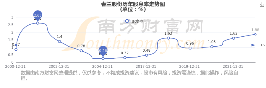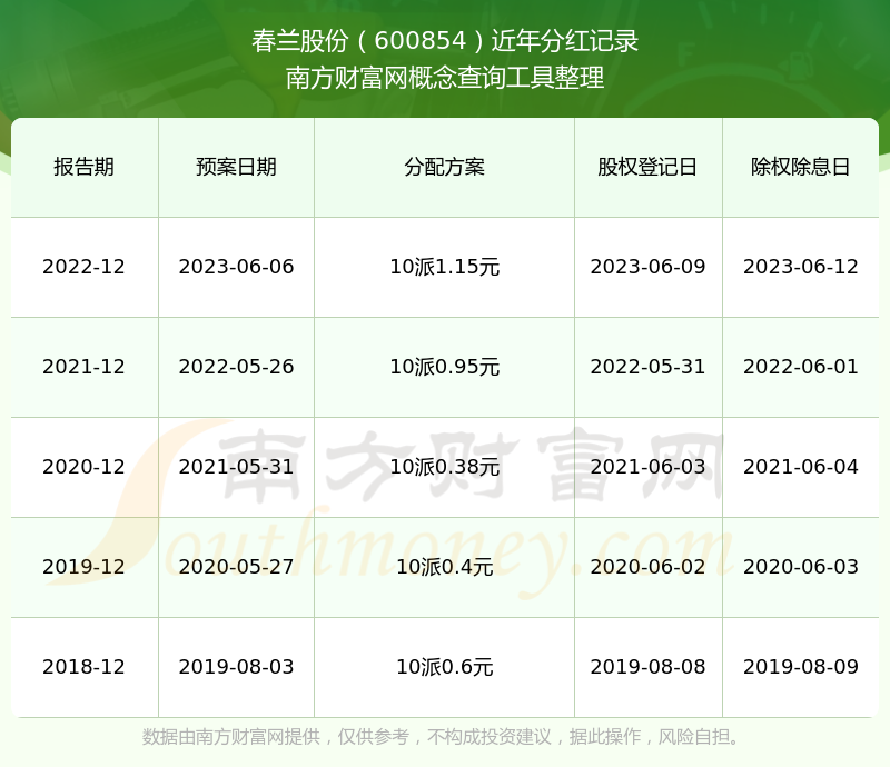 春蘭股份最新一次公布的分紅方案為10派1.15元。本次權(quán)益分派股權(quán)登記日為2023年6月9日,除權(quán)除息日為2023年6月12日,派息日為2023年6月12日。