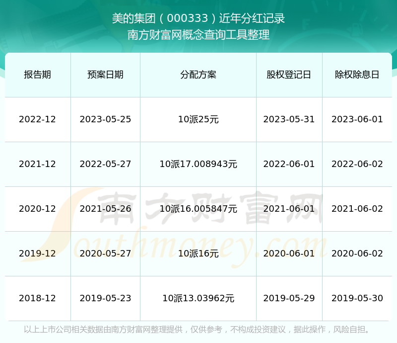 美的集團(tuán)最新一次公布的分紅方案為10派25元。本次權(quán)益分派股權(quán)登記日為2023年5月31日,除權(quán)除息日為2023年6月1日,派息日為2023年6月1日。