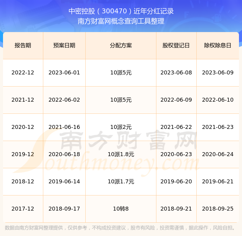 中密控股最新一次公布的分紅方案為10派5元。本次權(quán)益分派股權(quán)登記日為2023年6月8日,除權(quán)除息日為2023年6月9日,派息日為2023年6月9日。