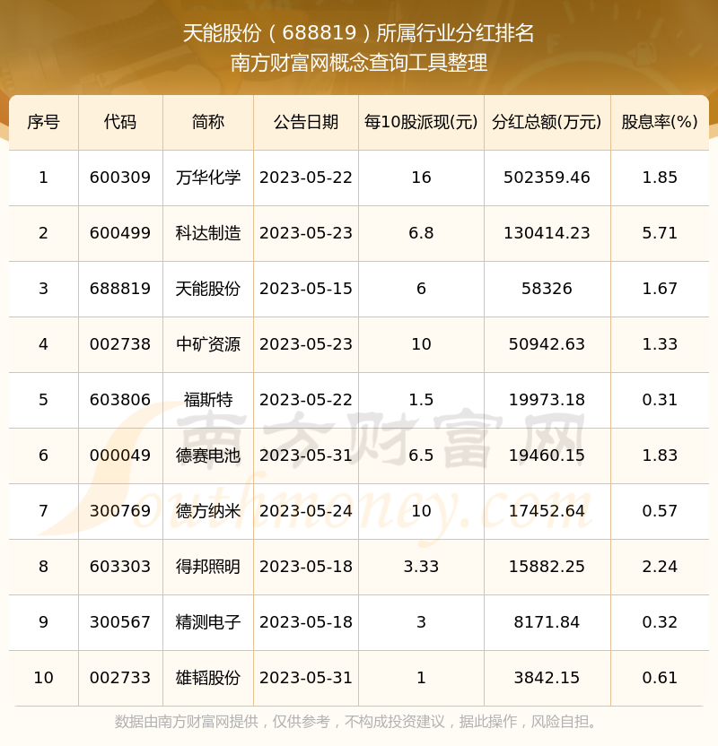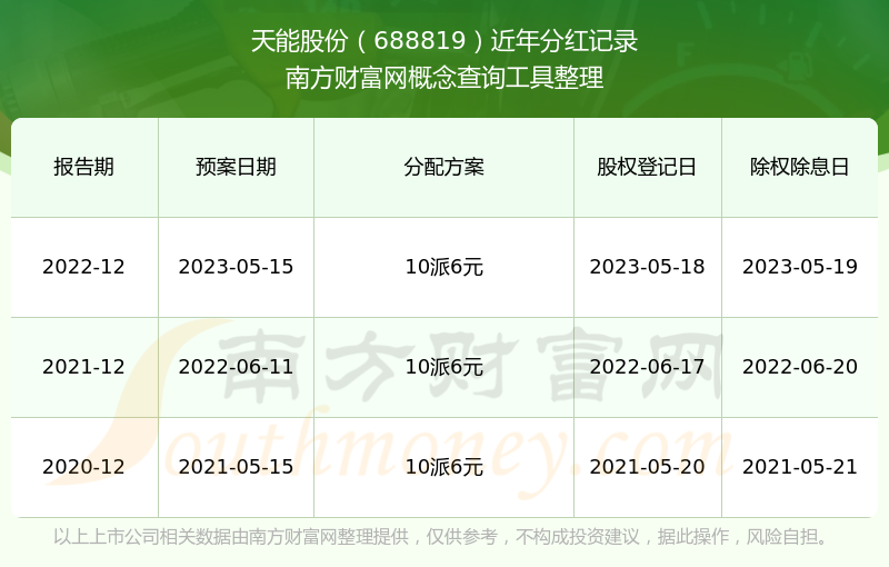 天能股份最新一次公布的分紅方案為10派6元。本次權(quán)益分派股權(quán)登記日為2023年5月18日,除權(quán)除息日為2023年5月19日,派息日為2023年5月19日。